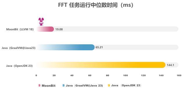 下面是 MoonBit 与 Java 实现的 FFT 算法的性能对比。FFT(快速傅里叶变换)是一个计算序列的离散傅里叶变换的高效算法。FFT 算法涉及大量数值运算和数组操作,可以很好地体现语言的基础性能: