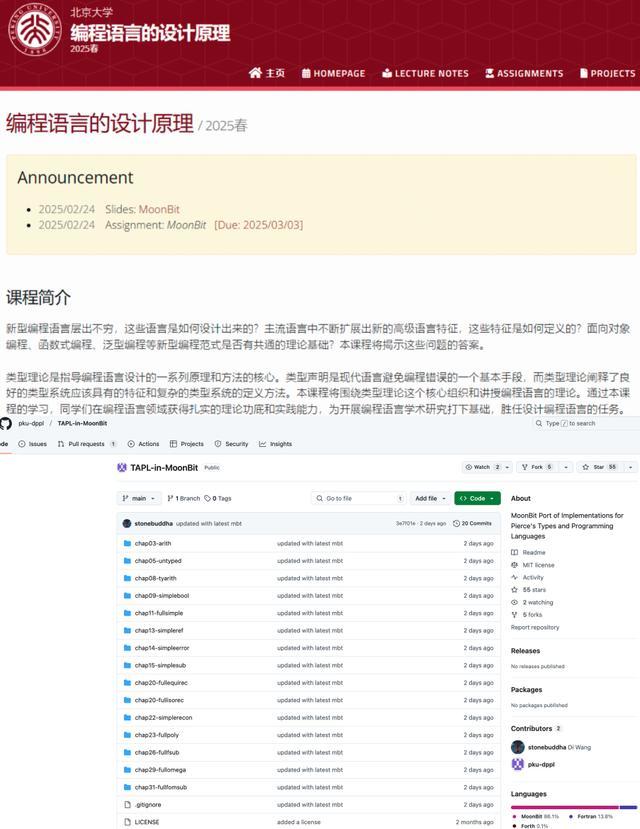 北京大学计算机学院的研究生课程《编程语言的设计原理》(https://pku-dppl.github.io/2025/)做出重要调整——自 2025 年春季学期起,MoonBit 替代 OCaml 成为该课程推荐的实践工具。