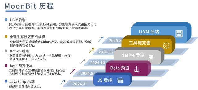 此前 MoonBit 相继推出了 JS、Native 后端,并在去年 8 月正式推出了 Beta 预览版本,今年初又新增了 LLVM 后端,板块布局已齐,接下来在异步支持等功能完善后,会在大约今年底的时间正式推出 1.0 版本。